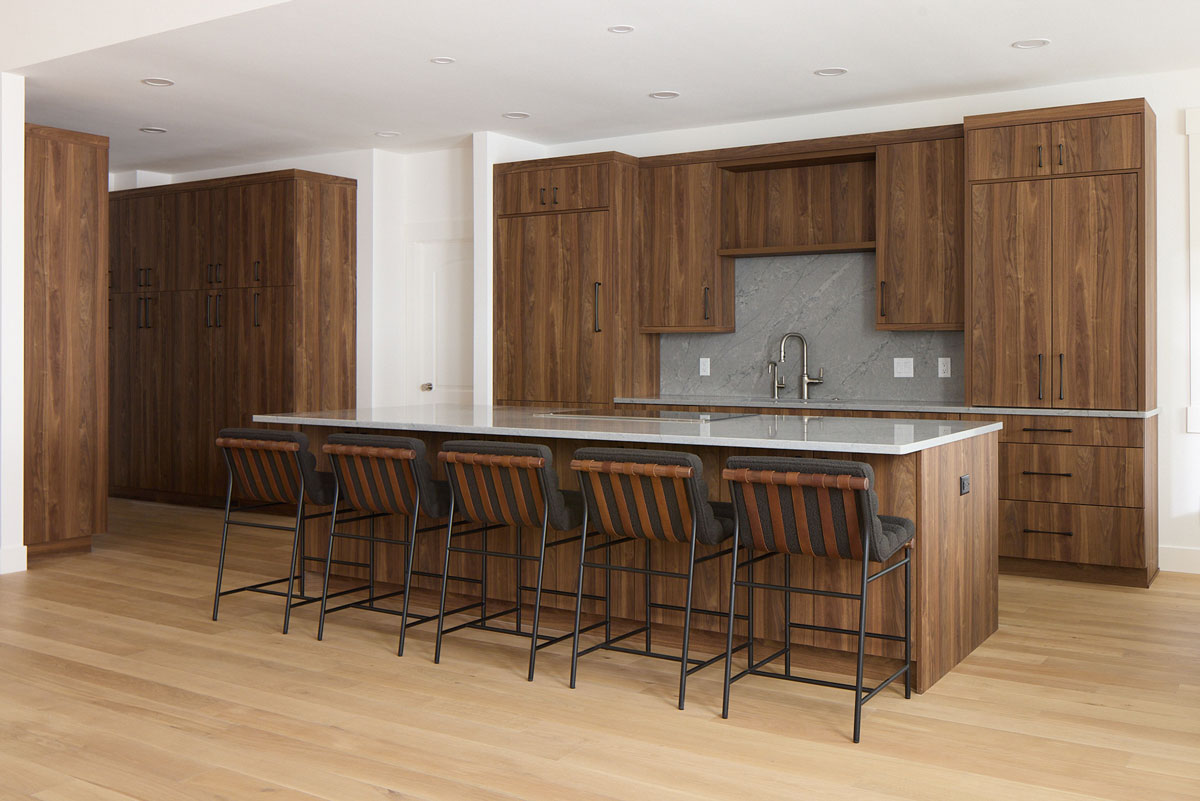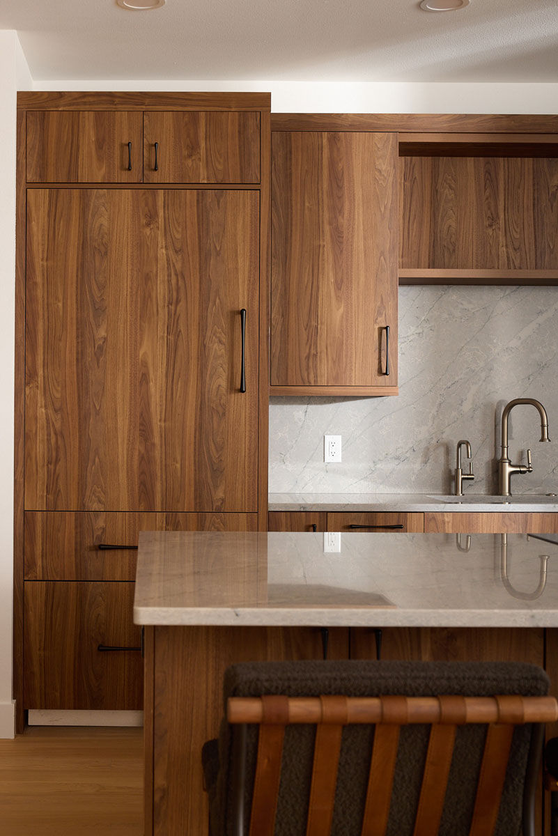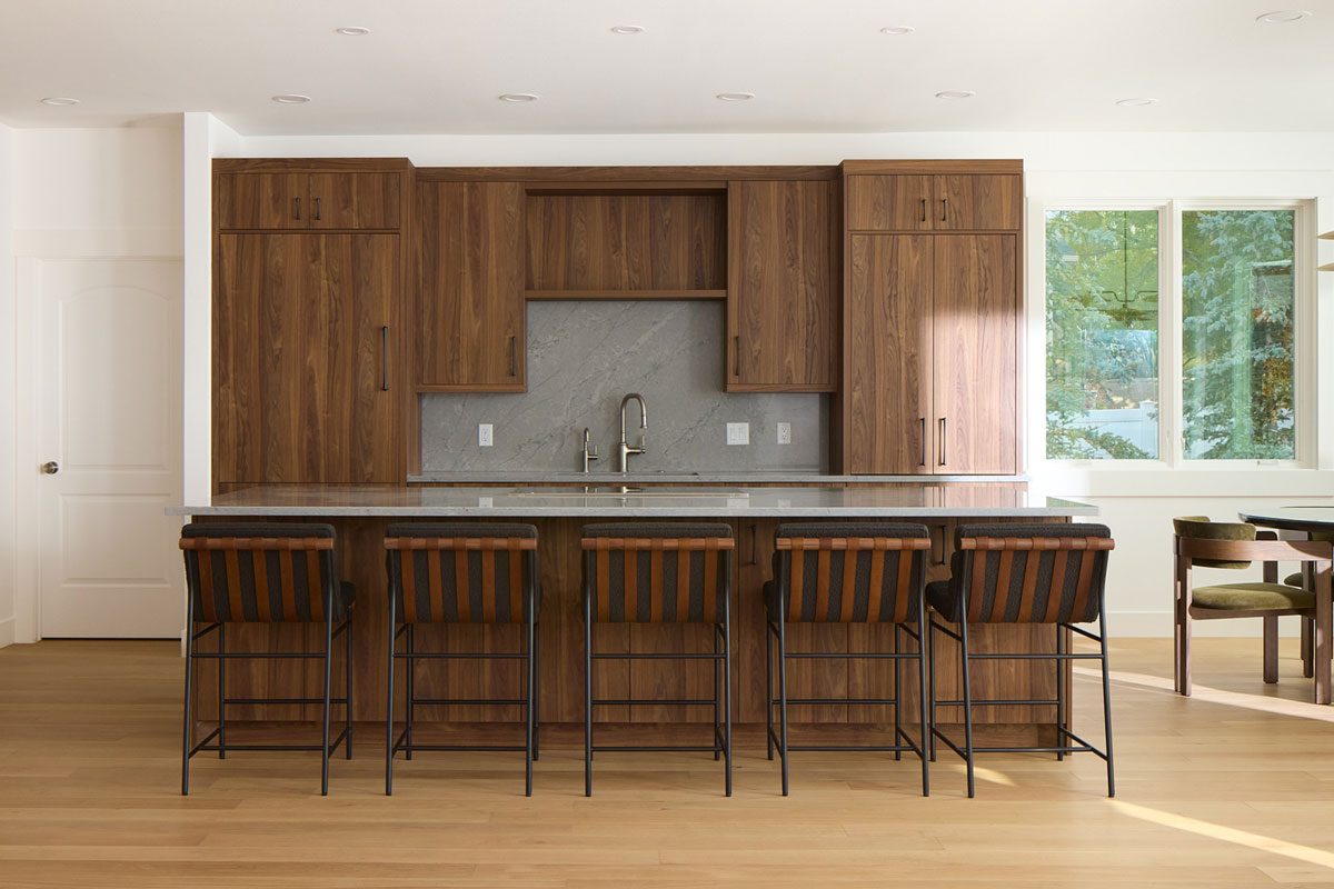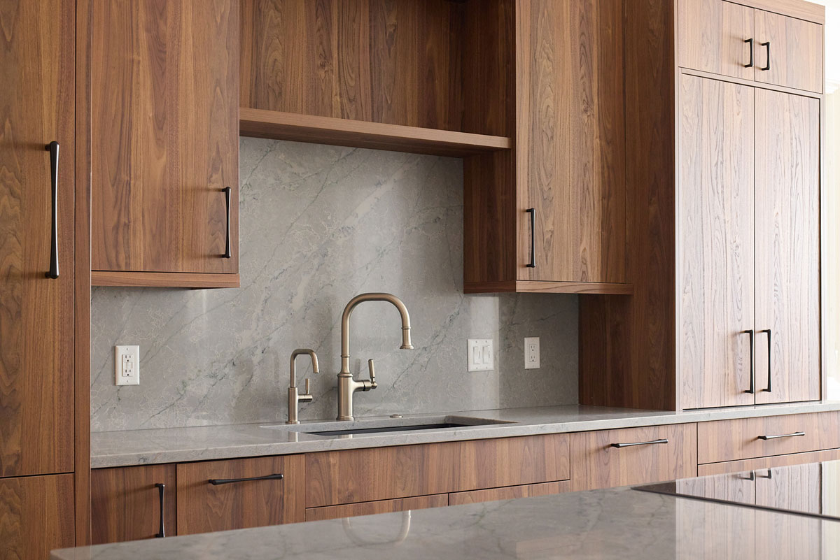 This warm modern kitchen remodel features rich walnut cabinetry paired with sleek grey quartz countertops for a timeless, elevated look. The natural wood tones, layered with matte black accents and minimalist detailing, create a sophisticated yet inviting space perfect for gathering and entertaining.