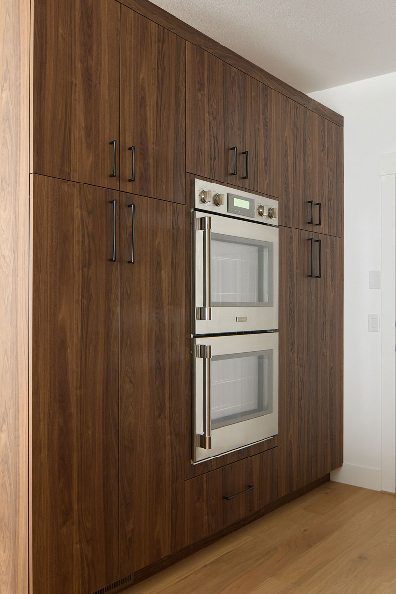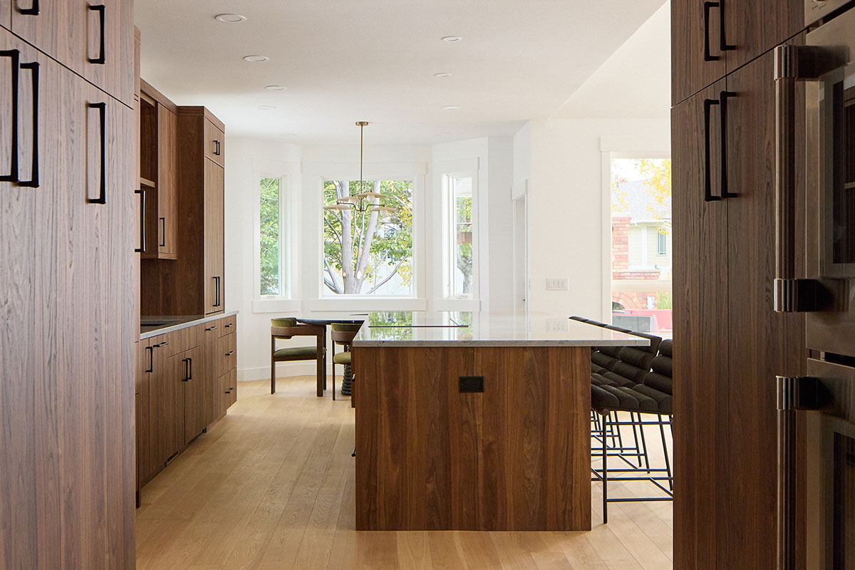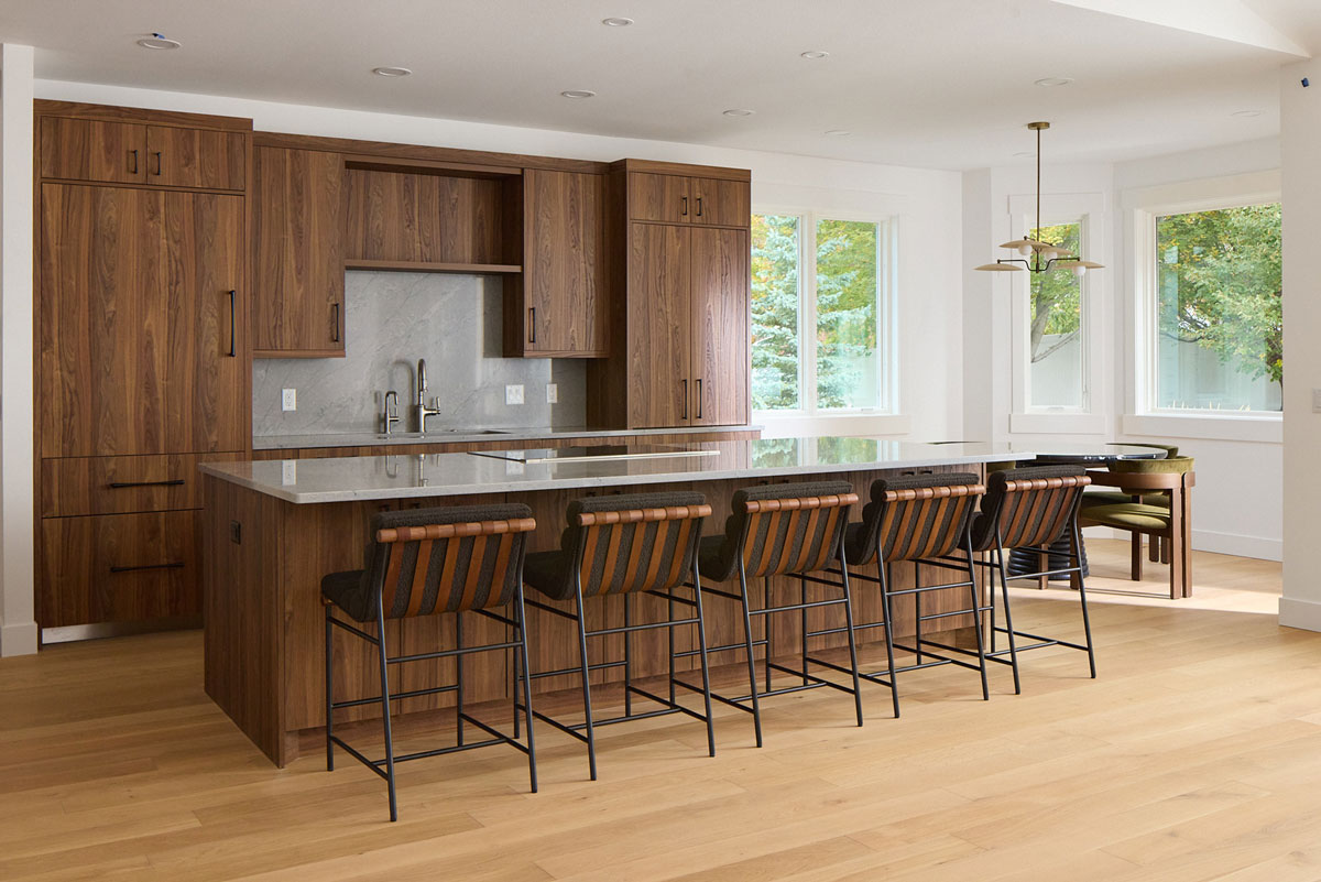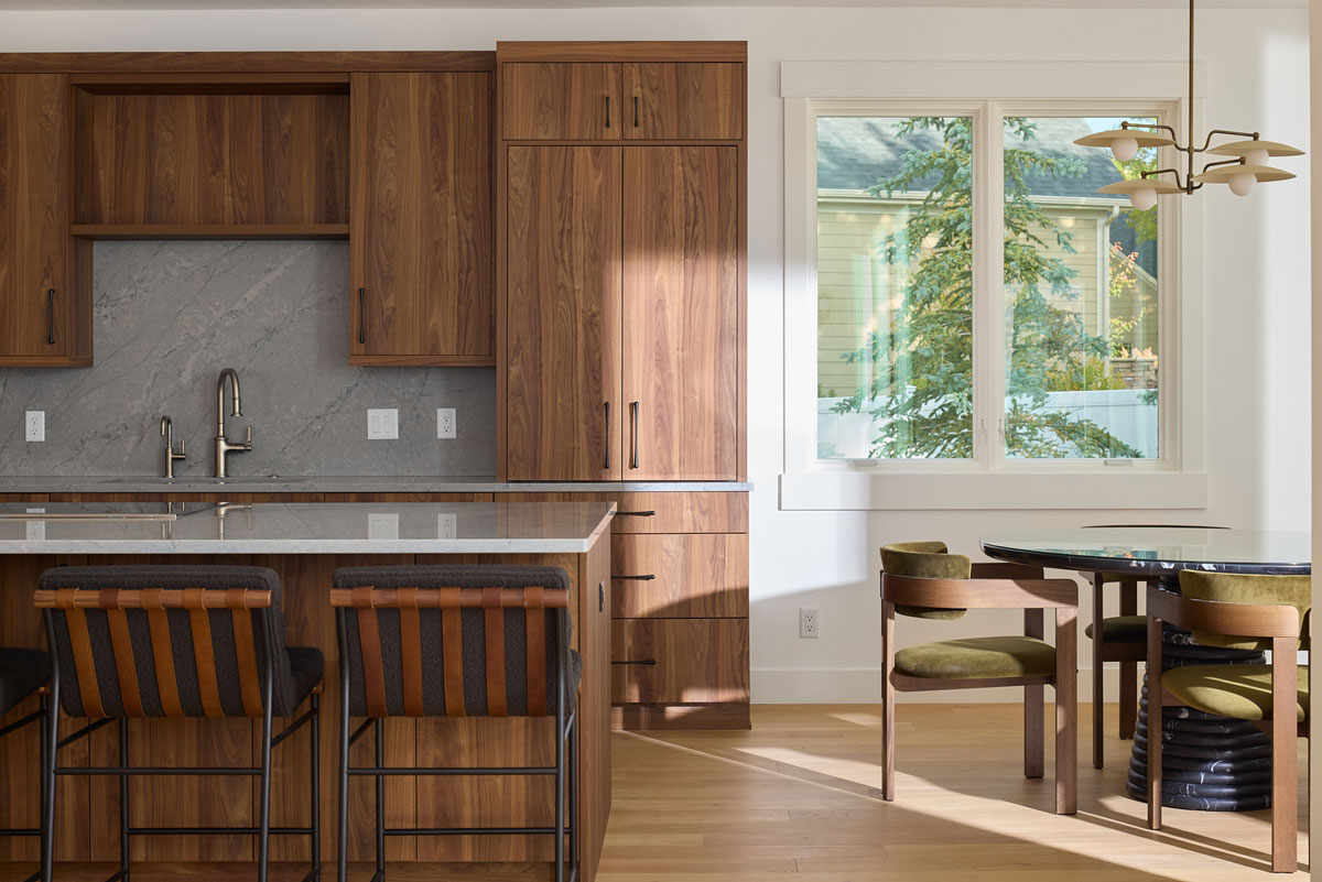 This warm modern kitchen remodel features rich walnut cabinetry paired with sleek grey quartz countertops for a timeless, elevated look. The natural wood tones, layered with matte black accents and minimalist detailing, create a sophisticated yet inviting space perfect for gathering and entertaining.